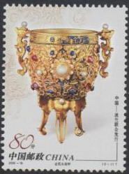 切手印面下部 および 金杯の上面縁部に 金甌永固杯 の文字が表記。 元素名としての「金」が判読できる。 金甌永固杯 (18世紀 清朝)Empire Lasting Forever Gold Cup ポーランドの クダニスク地方の銀のマグBaroque Cup (巴洛克杯) と共に共通の図案で共同発行された。 郵趣 vol. 60(2006) 760p 769p (9月号) |
