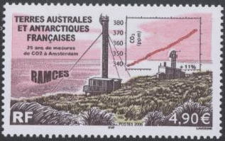 | 印面中の折れ線グラフの縦軸にCO2が表示。 折れ線グラフについて 縦軸CO2 conc. (単位 ppm目盛り330~390) 横軸 観測年 (単位年 目盛り1980~2005) 赤プロットは Amsterdam島でのCO2 conc. の観測値 で年ごとに増加の傾向を示している。 フランスは Amsterdam島 を含め世界中に17か所の観測網を配置して地球規模で温室効果ガスの経年追跡をおこなっている。 観測網としては Amsterdam島 が最も古く1980年に開設されて2005年で25年を迎える。 RAMCES とはReseau Atomospherique de Mesure desComposes a Effect de Serreの略。 (英文で The network of atmosphericgreenhouse gas measurements ) (和文で大気の温室効果ガス観測のネットワーク ) Amsterdam島とは南緯 37°57' 東経 77°32' に位置するインド洋南端の仏領の島。オランダのアムステルダムではありません)。 他の観測網 Mace Head 北緯 53°20' 西経 9°54'(アイルランド国内 1992年開設) Saclay 北緯 48°45' 東経 2°10'(フランズ国内 2001年開設) 等 郵趣 vol. 60(2006) 237p(3月号) |