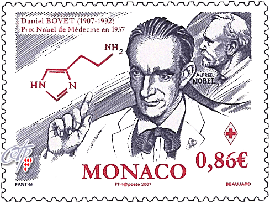 ダニエル・ボベ (1907~1992)イタリア 1957年 クラーレ様筋弛緩剤の合成に関する研究でノーベル医学・生理学賞を受賞。 南米の先住民が矢に塗る筋弛緩性の作用を持つ毒クラーレを人工的に合成することに成功。 切手上の構造式はヒスタミン(Histamine)を示す。 C5H9N3 分子量111 2-(4-imidazolyl)ethylamine (慣用名) 1H-imidazole-4-ethanamine (IUPAC命名法) ヒスタミン 毛細血管を拡張するなど顕著な生理作用を示し, 組織内で多量生成した場合は種々のアレルギー症状を起こすといわれている。赤身の魚は鮮度が低下すると多量のヒスタミンが生じアレルギー様食中毒を起こす。特にサバはヒスタミンを生じ易く「サバに酔う」症例が多い。 |