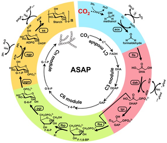 この合成法は、最初二酸化炭素を、水素添加触媒を用いて「化学的」に、メタノールに還元するが、それ以降は系中に存在する種々の酵素の作用により、一つの酵素反応の生成物が、次の酵素反応の基質となり、自動的に多段階の変換が進み、最終的に澱粉が生じるという大変効率の良いプロセスである。二酸化炭素から澱粉への変換速度は、トウモロコシの約8.5倍であったという。この基本的プロセスの設計はコンピュータによって行われたが、合成の実施に際しては酵素反応の鑑賞などの不都合を避けるためにタンパク質工学による酵素の修飾なども加えて最適化を行った。