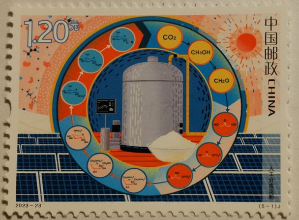 中国 「科学技術創新(人工合成澱粉)」 2023年発行 詳細反応経路と「科学技術創新」切手全景