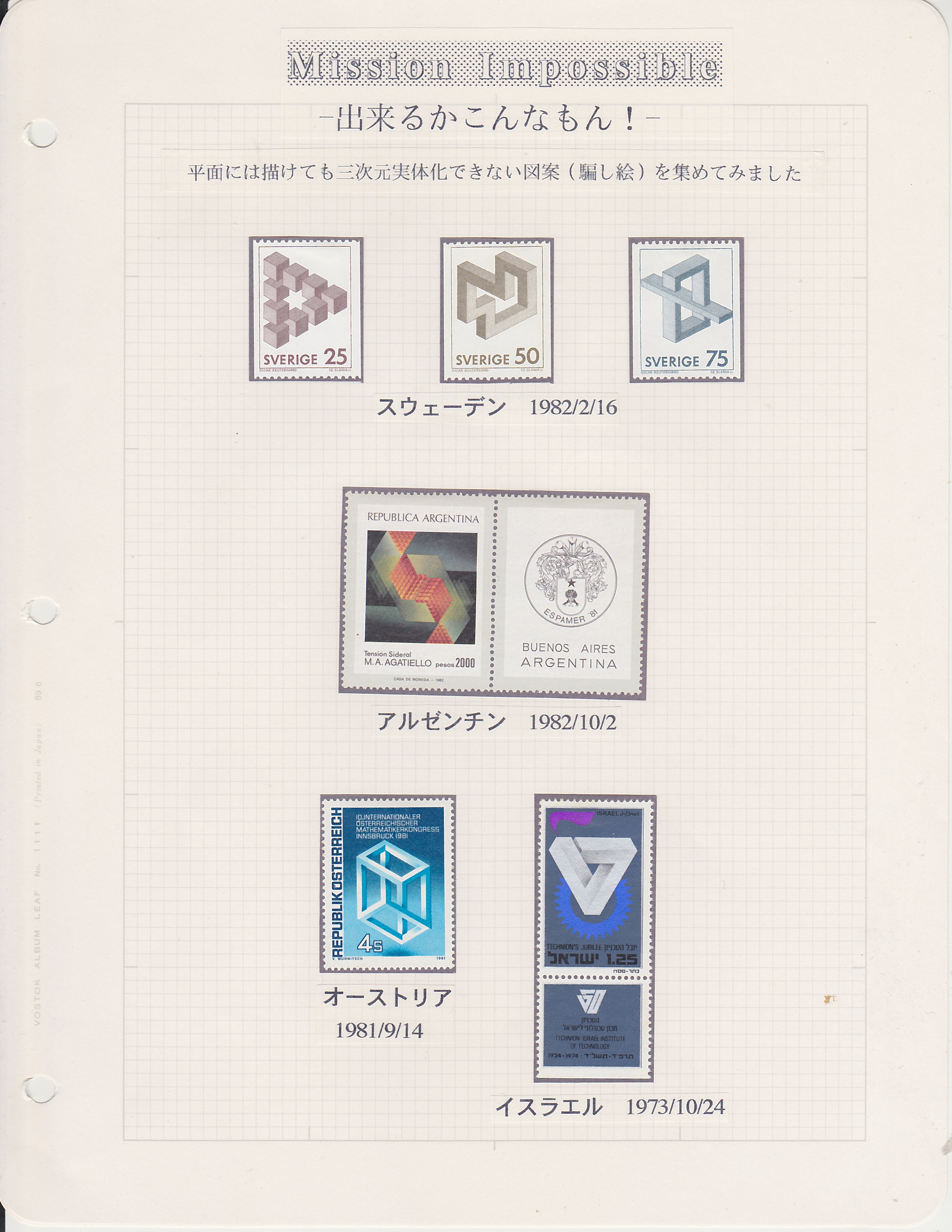 いわゆるだまし絵の切手です。30年位前に作りました。エッシャーの奴は入れてません。あれは芸術だからという理屈では無く、その時単に持ってなかっただけという話ですが。